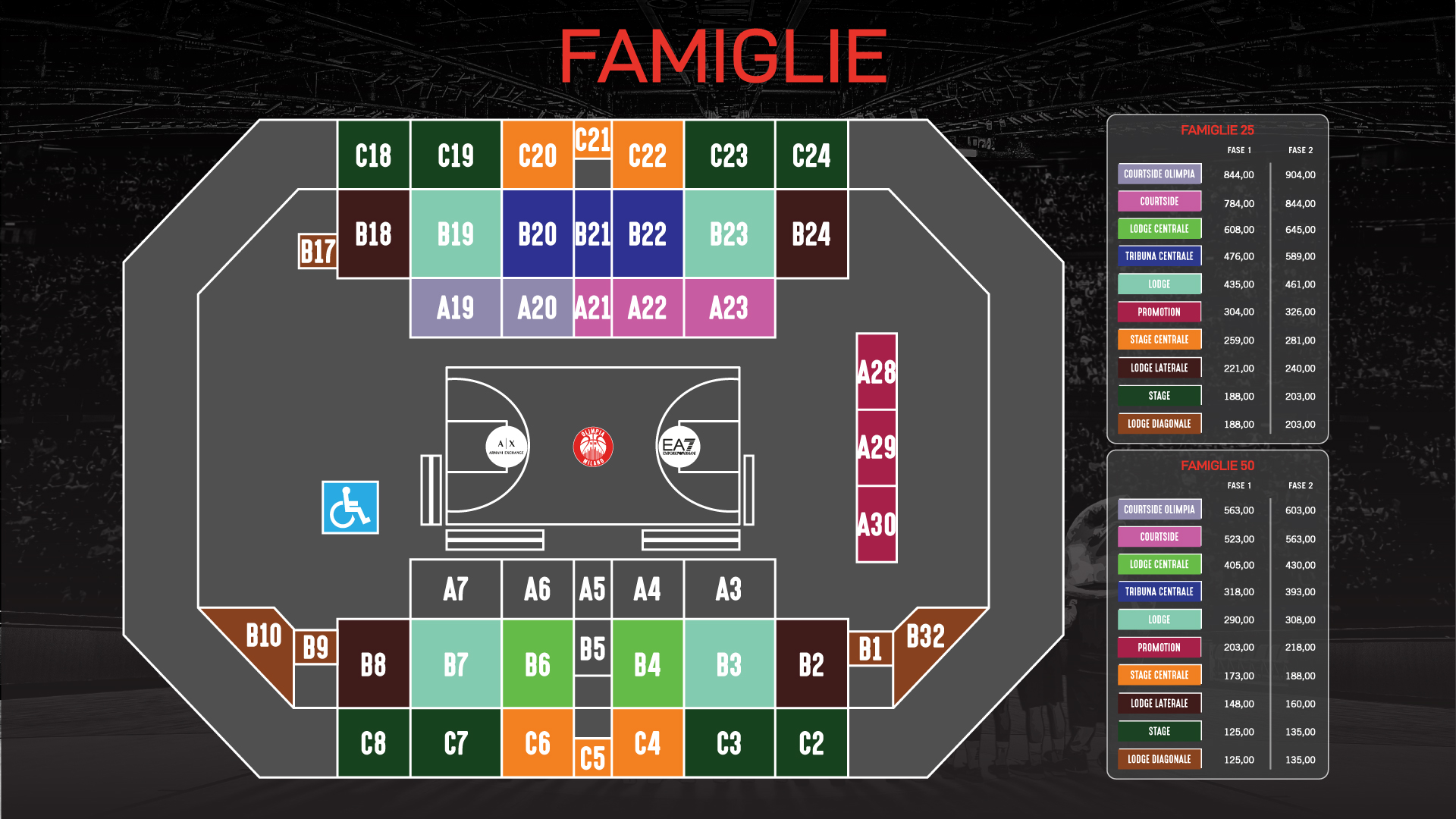 I nuclei con almeno un/una figlio/figlia minorenne possono acquistare l’abbonamento Famiglie. La promozione è disponibile su tutti i settori tranne Premium, Corporate, Executive, Fan Zone. L’abbonamento “Famiglia” è disponibile a partire da nuclei di 3 persone. Per l’acquisto è necessario presentare lo stato di famiglia su carta semplice (autocertificazione). I primi due abbonamenti sono “scontati” del 25% e il terzo e tutti quelli ulteriori del 50%. Per conoscere tutti i prezzi degli abbonamenti riservati alle famiglie controlla la mappa qui sotto.
