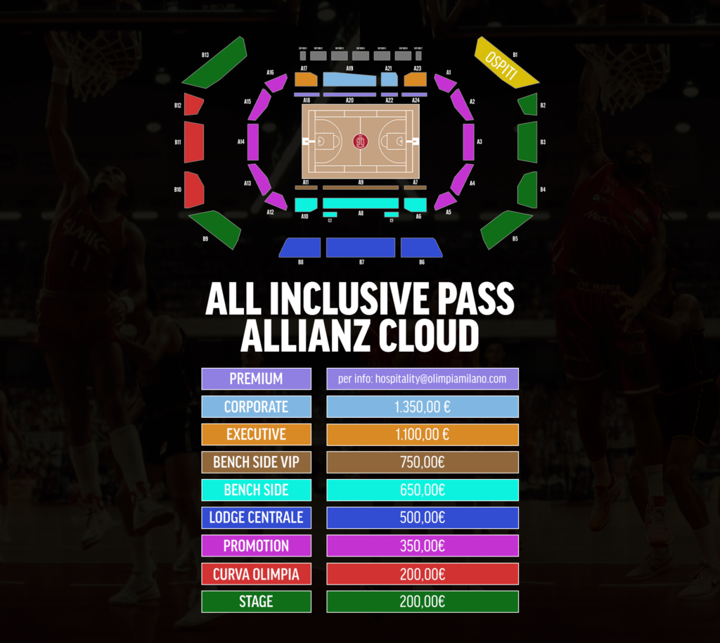 Per le partite casalinghe dell’Olimpia Milano in programma all’Allianz Cloud, la società propone un’unica formula di abbonamento, riservata esclusivamente a chi ha già sottoscritto l’abbonamento per l’Unipol Forum: All Inclusive Pass Cloud – Back to the Origins.