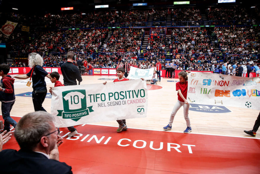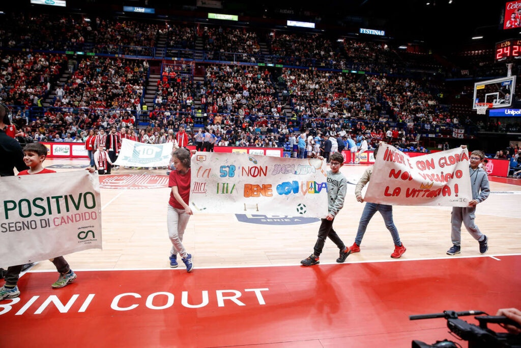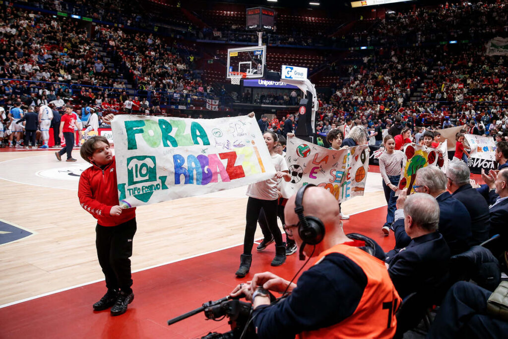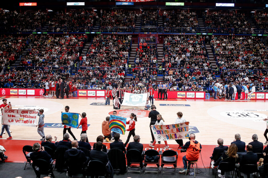 Alla fine del terzo quarto di gioco il parquet del Forum si è trasformato in un palcoscenico di emozioni: gli studenti hanno sfilato portando in campo gli striscioni realizzati in classe, frutto di un percorso creativo e educativo dedicato ai valori dello sport e alla storia dell’Olimpia Milano.