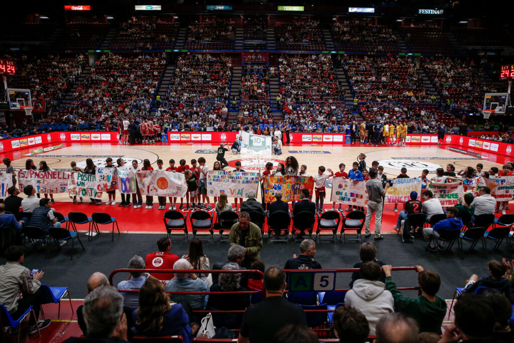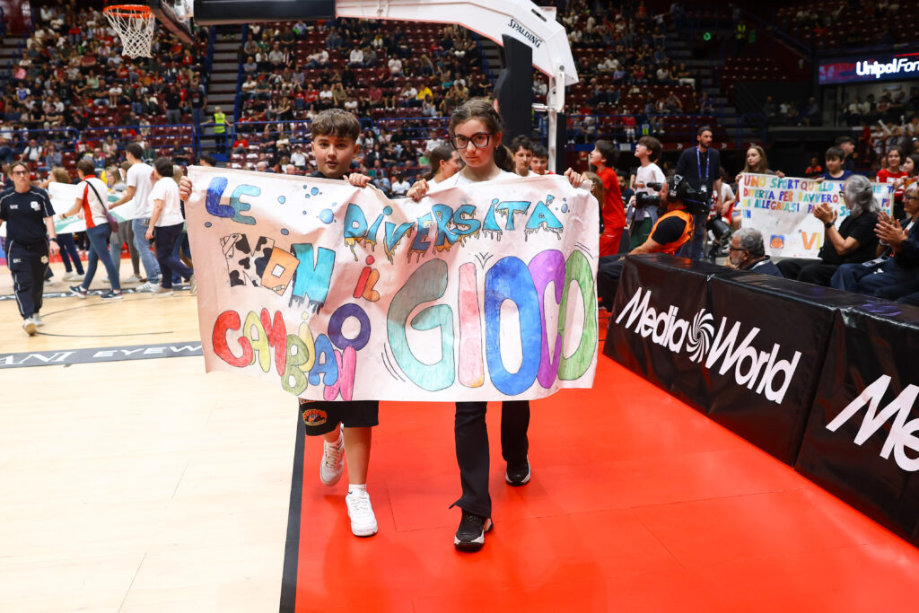 Durante il terzo quarto della partita, i bambini degli istituti coinvolti nell’ultima tappa hanno sfilato sul parquet con gli striscioni realizzati nelle loro classi, esprimendo creatività e impegno. Al centro del campo, i responsabili di Comunità Nuova Onlus, gli educatori e i professori hanno ricevuto un riconoscimento per il loro fondamentale contributo al successo del progetto.