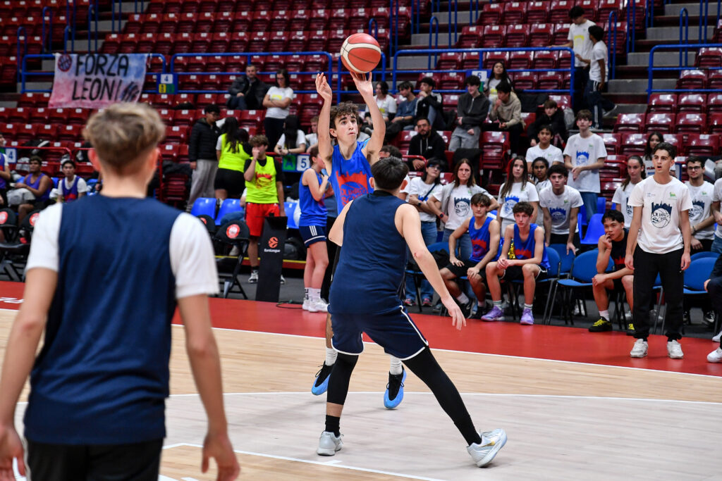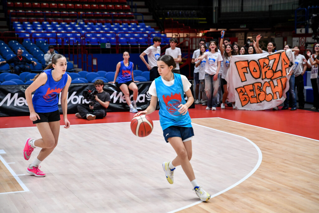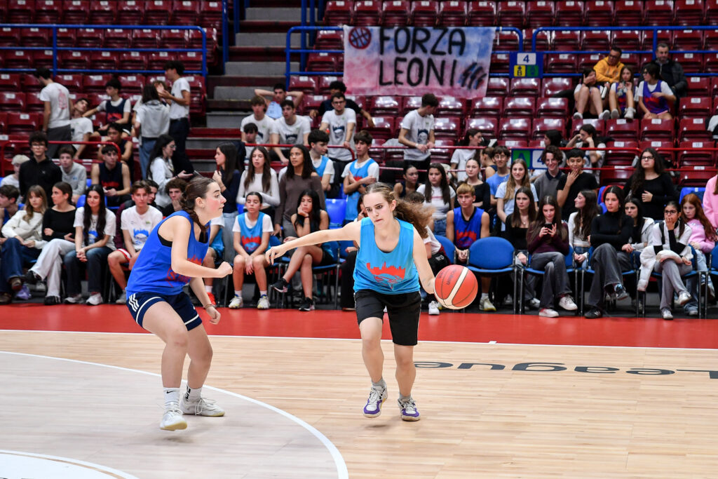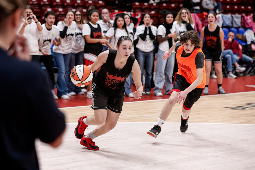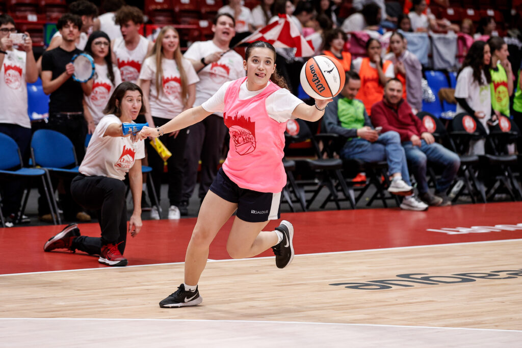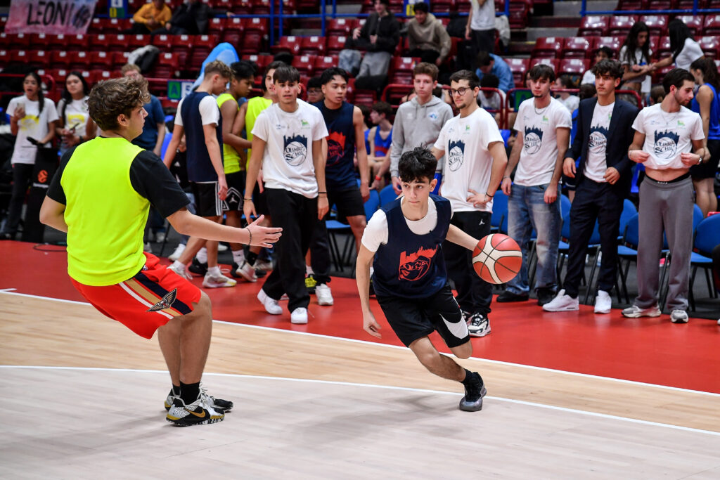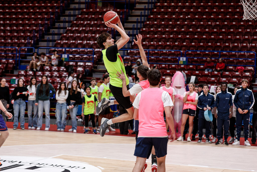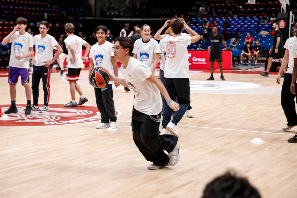 Prima di assistere alla partita dalla tribuna dedicata, le classi hanno preso parte a una gara di palleggio e tiro, ultima attività della giornata prima di vivere il momento del tunnel d’ingresso dei giocatori accompagnando i giocatori di Olimpia Milano in campo.